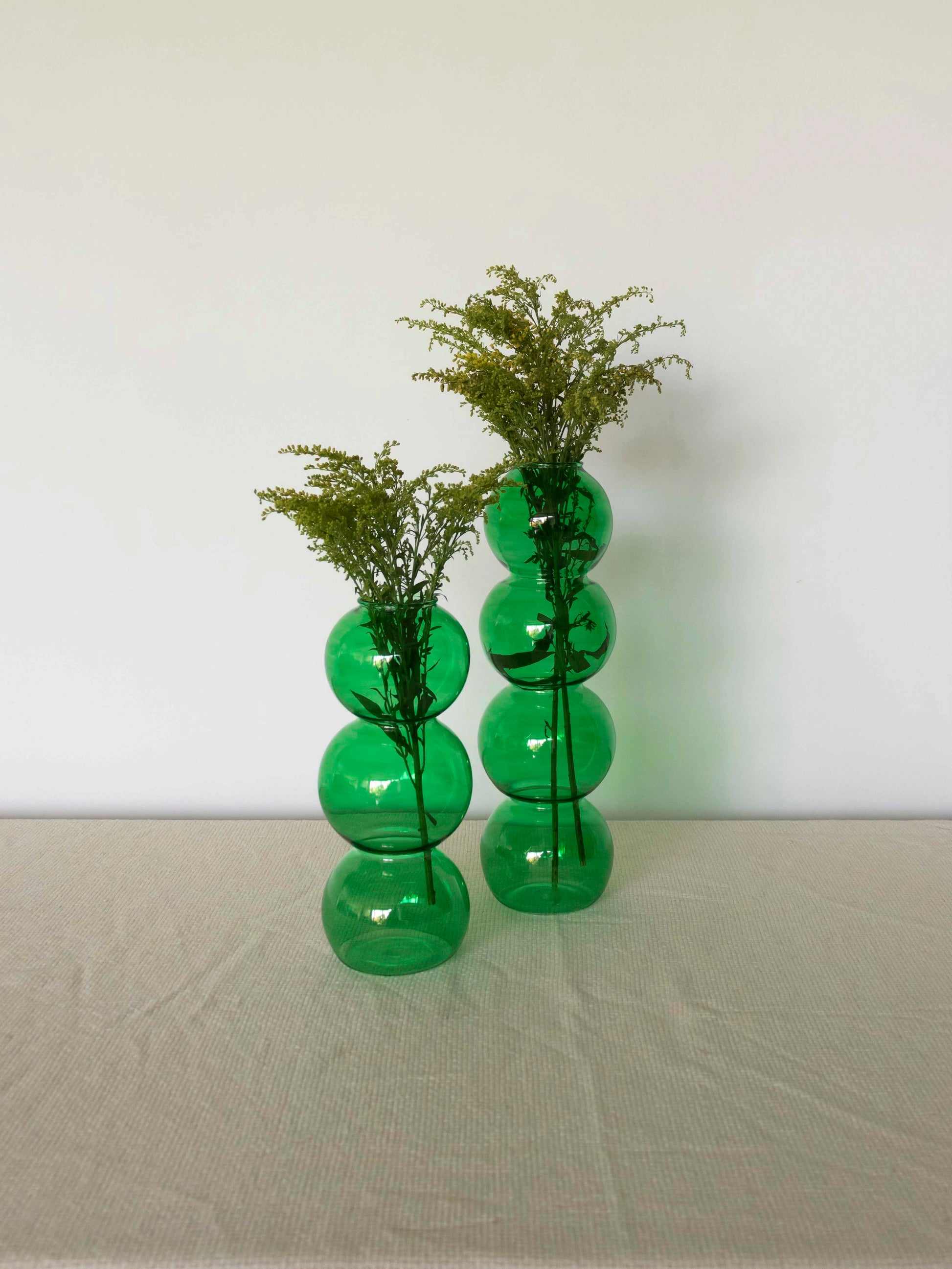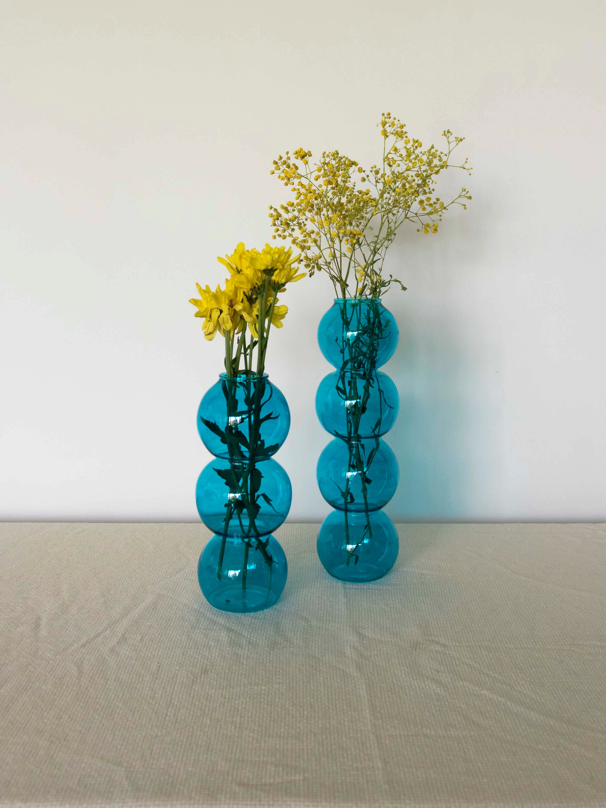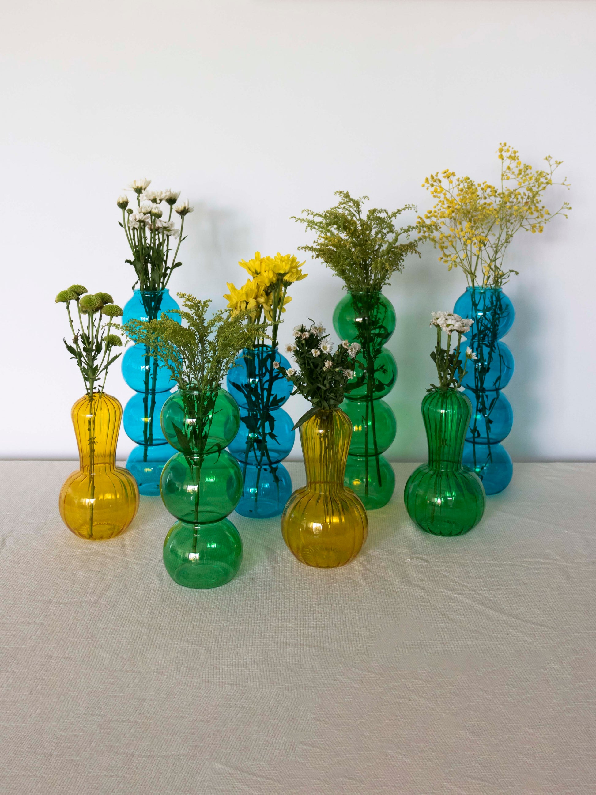 Add a pop of color and playful elegance to your space with the Bubble Cascade Vases. Available in green, blue, and transparent, these Pyrex glass vases feature a charming bubble texture that catches light beautifully, making them perfect for fresh blooms or as standalone decor.