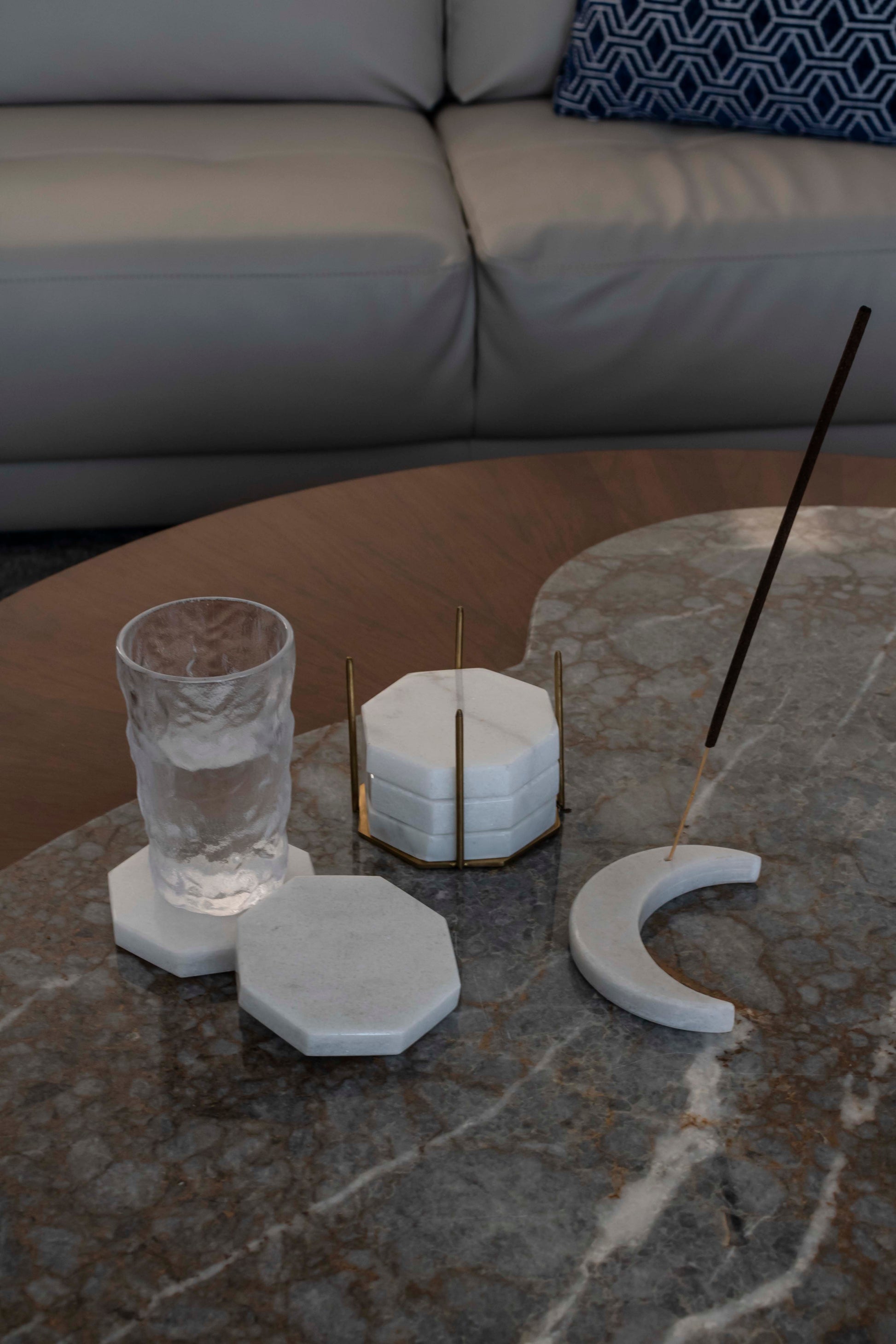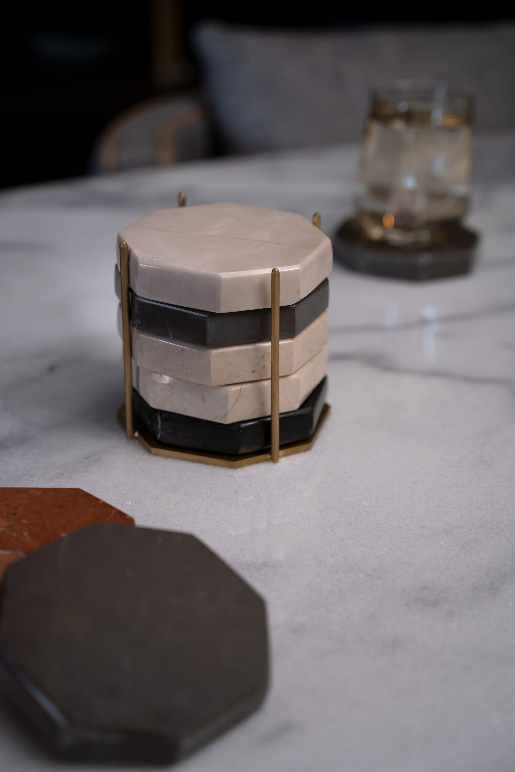 Set of 5 Marble coasters with a gold metal holder.