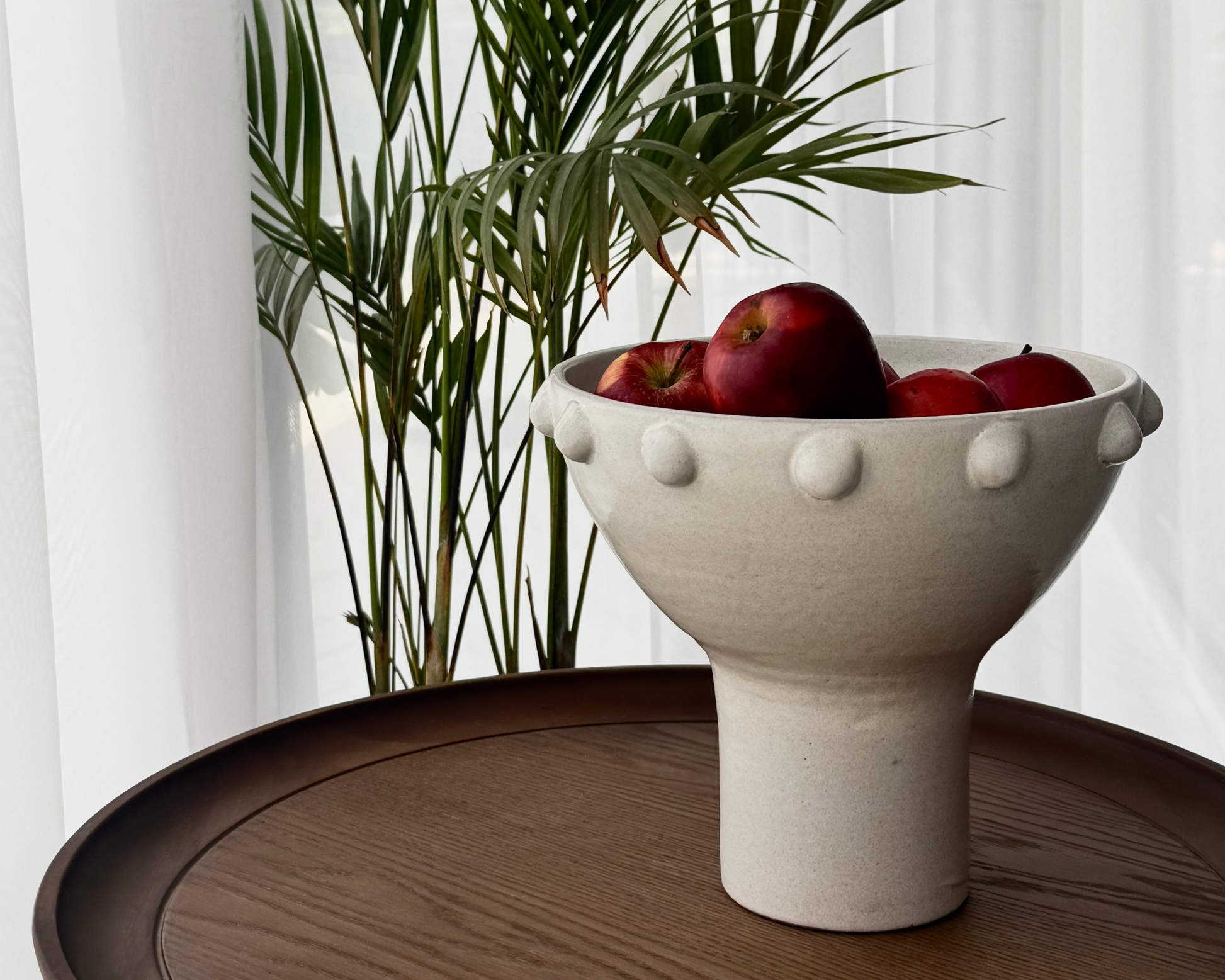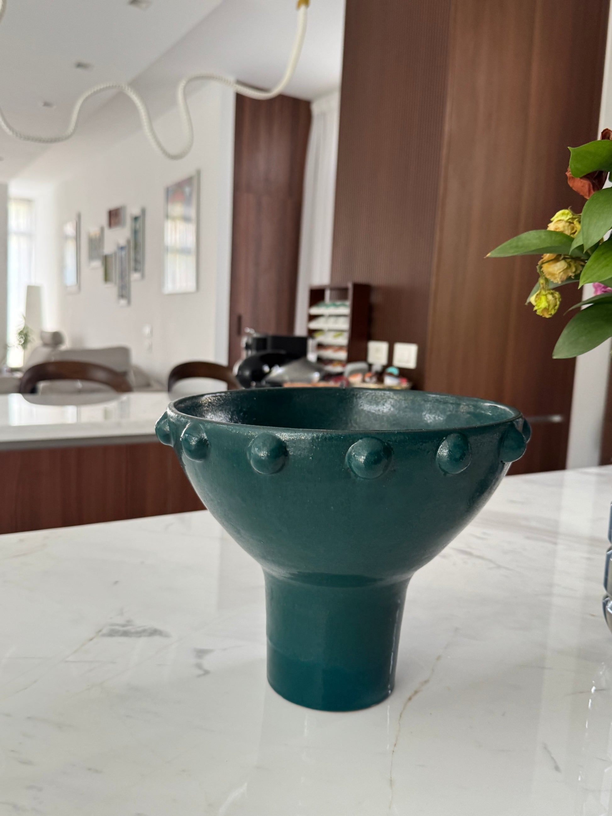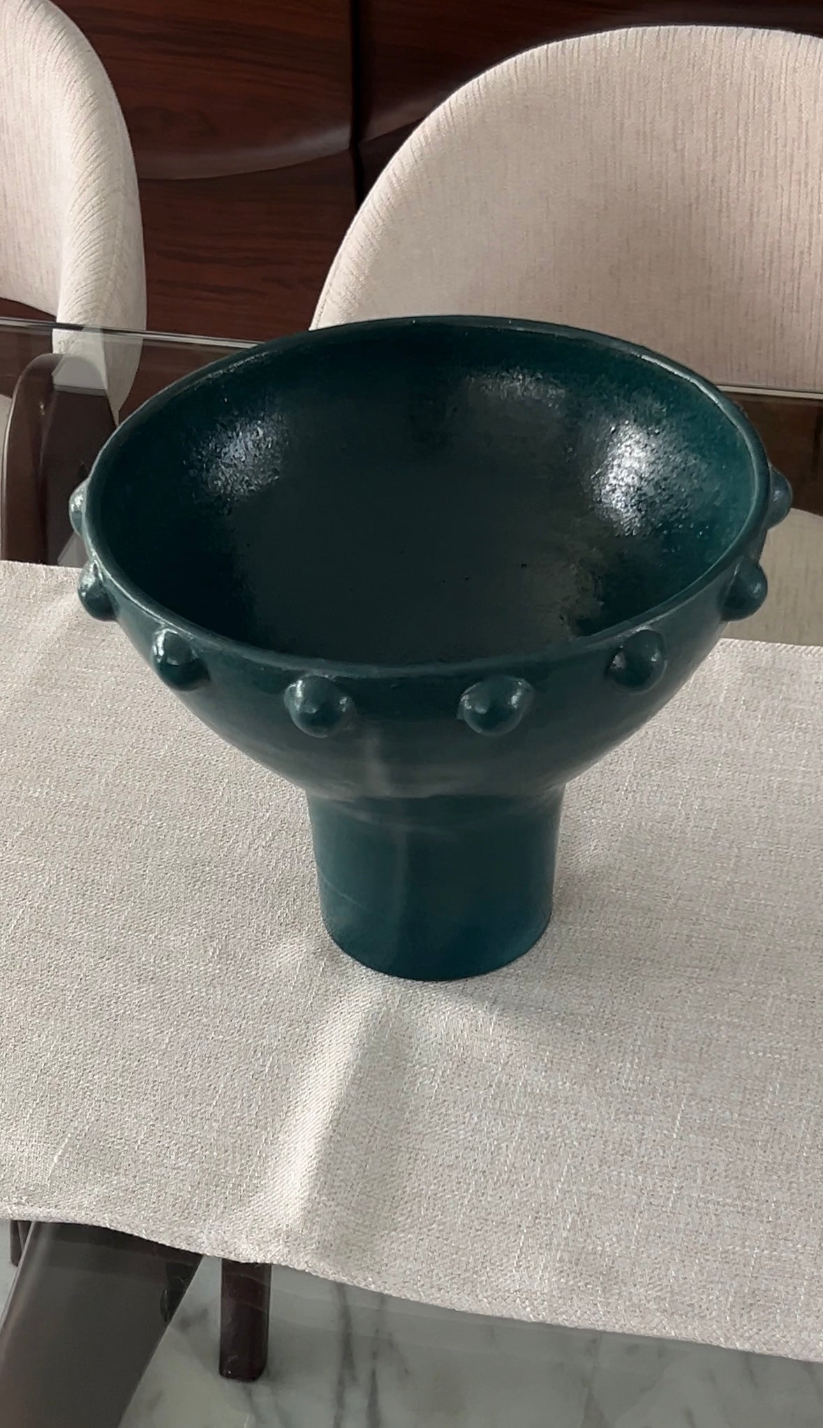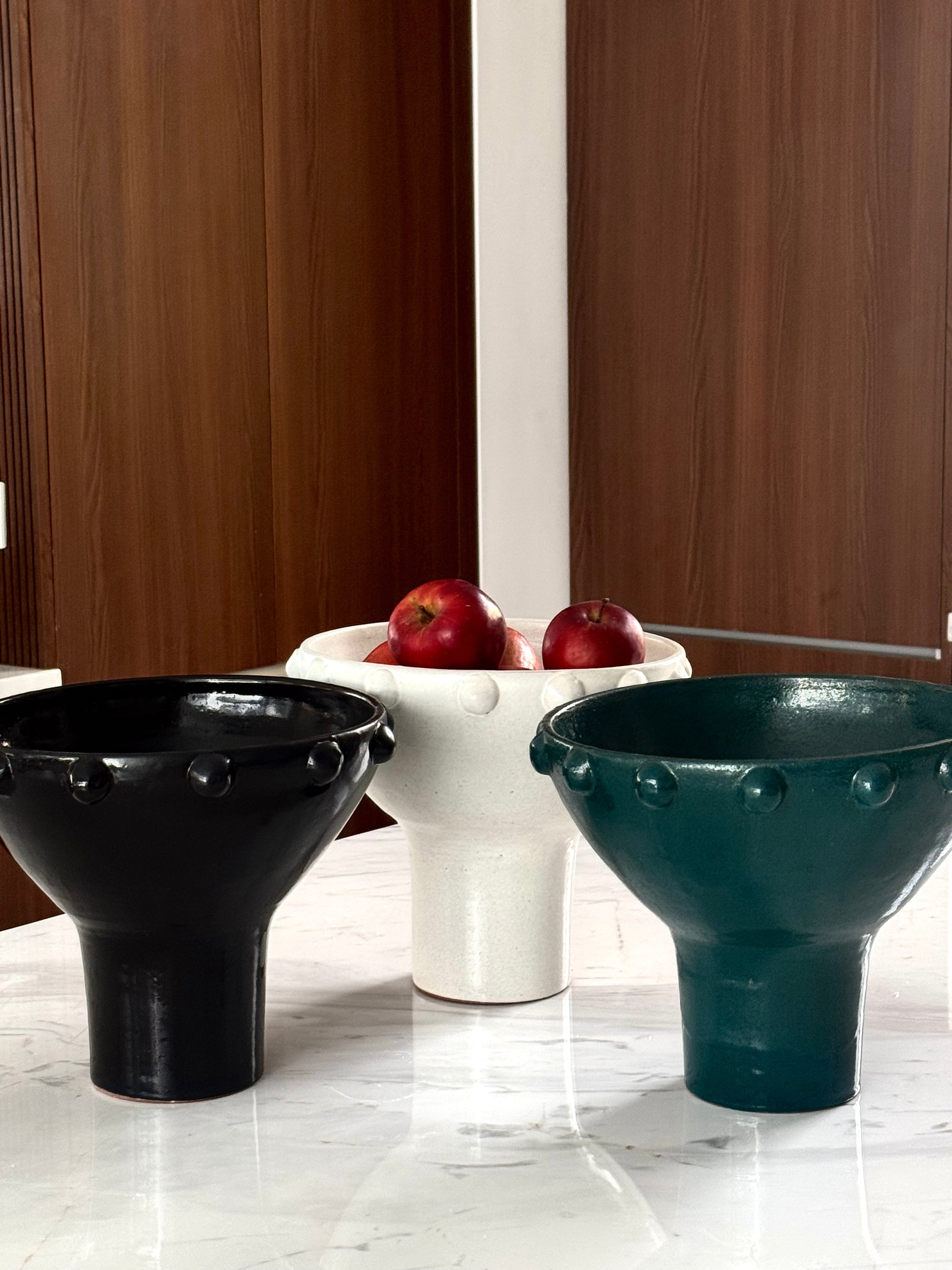 A bold, sculptural bowl handcrafted from glossy colored pottery. With its elevated base and rounded form, The Dome brings both presence and versatility to your space. Use it as a fruit bowl, a food-serving piece, or a decorative centerpiece.